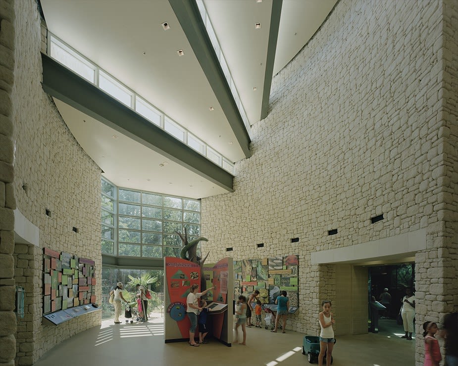 Guests entering from the sunny Texas sunshine are brought into a vestibule that is daylit and just below water level to observe the amphibians swimming in the adjacent lake. Then they progress into a darkening gallery where the guest area is quite low-level, while the exhibits appear to glow, each with their own quantity and color temp of light. The dappled-light gallery feels as if one is moving through a rain forest, with sunbeams created by spots shining through printed acrylic hexagonal panels to create shafts of sunlight.