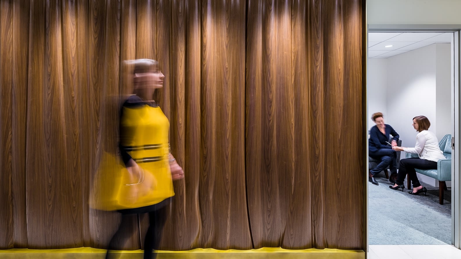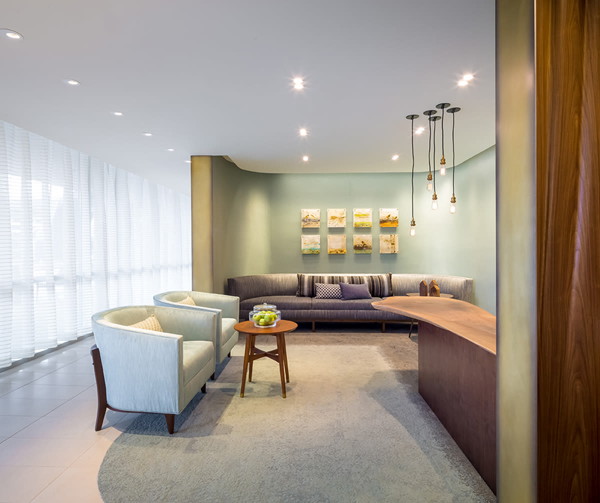 Located on the entry level of Children’s Health main tower, the Fetal Evaluation and Treatment Alliance (FETAL) at Children’s Health is a series of consultation rooms, telehealth suites, and offices, connected by a common corridor and waiting lounge, all treated with soft corners and warm tones. The main focal point is a wood veneer wall that waves and folds along the length of the corridor to mimic the flow of a curtain. This is balanced by a simple sheer curtain on the opposite side to softly diffuse the daylight.