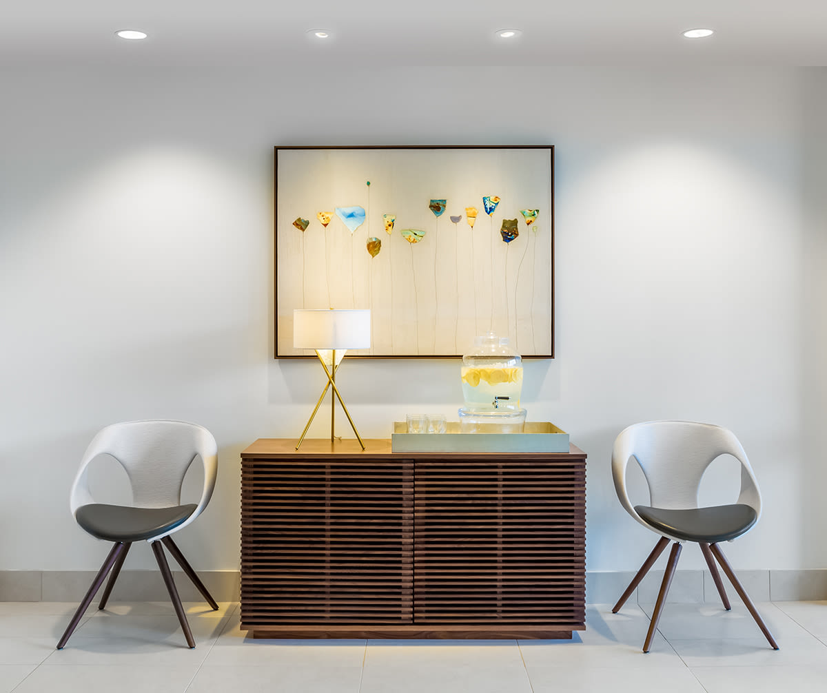 On a tight lighting budget, to allow for the sumptuous and comforting material finishes, the simple downlighting solution has recessed light fixtures situated close to the wood wall, aimed at a slight angle, which highlights the undulating surfaces, creates movement with light, and bounces light back in to the corridor for a rich warm circulation experience. The waiting area has a perimeter lighting system to envelop the patients, providing a warm and comfortable experience. Downlights in this area are a double head with oval aperture and a smooth, curved transition from ceiling plane up into the apertures. Consultation rooms are simple, yet comfortably lit. The project also included the entry canopy for direct access from the exterior as well as the connection corridor from the main lobby..