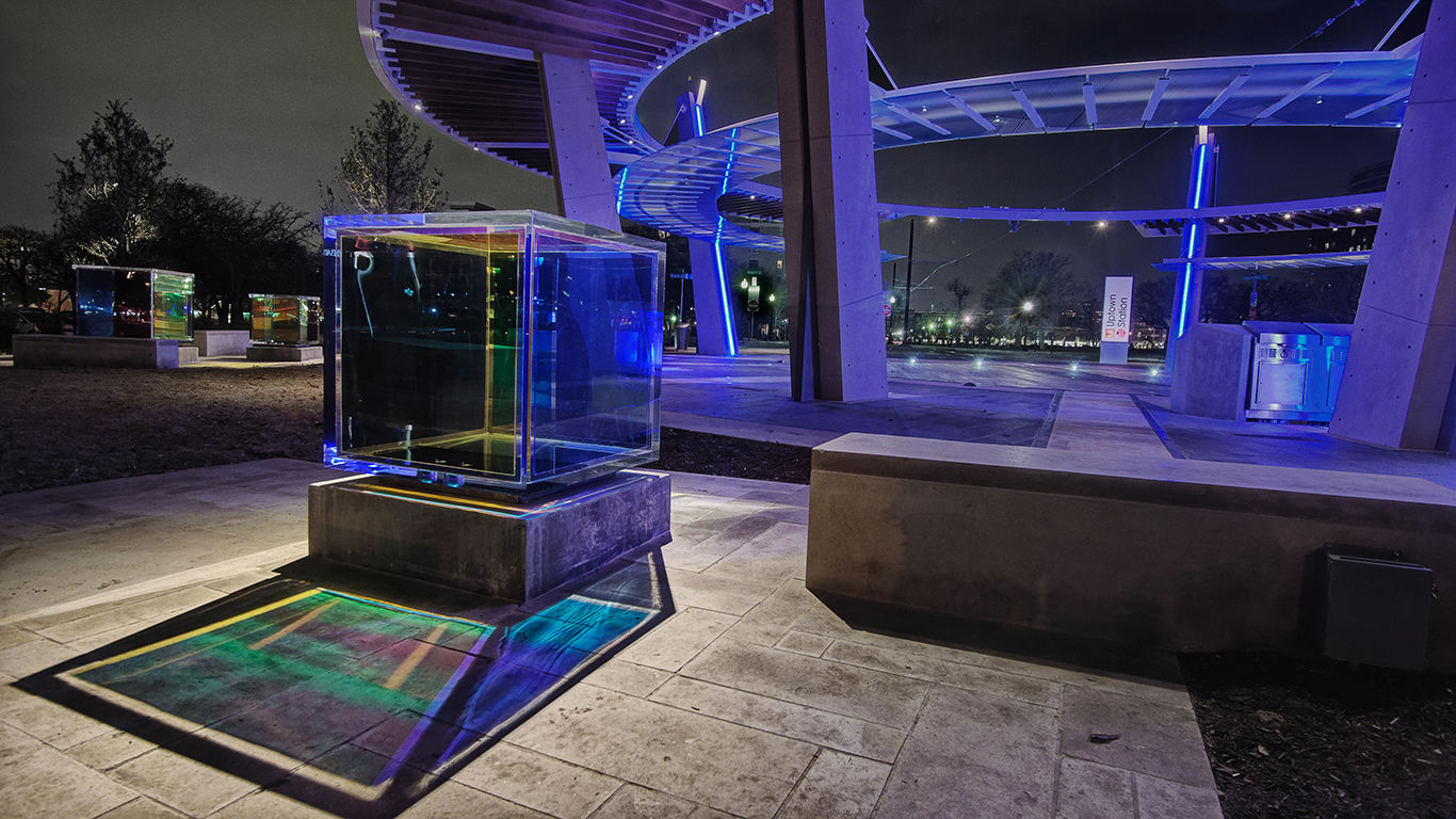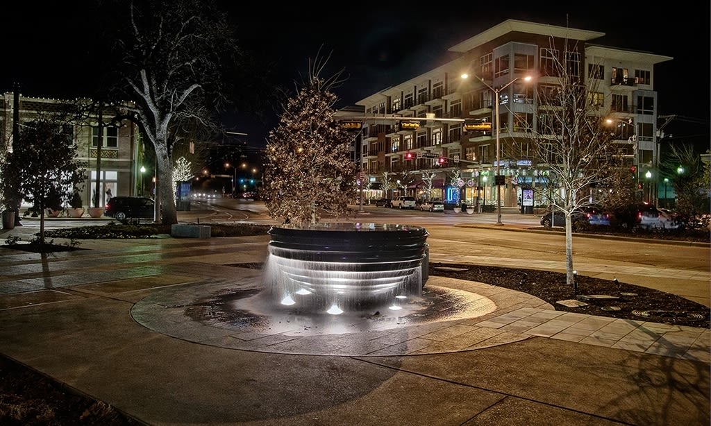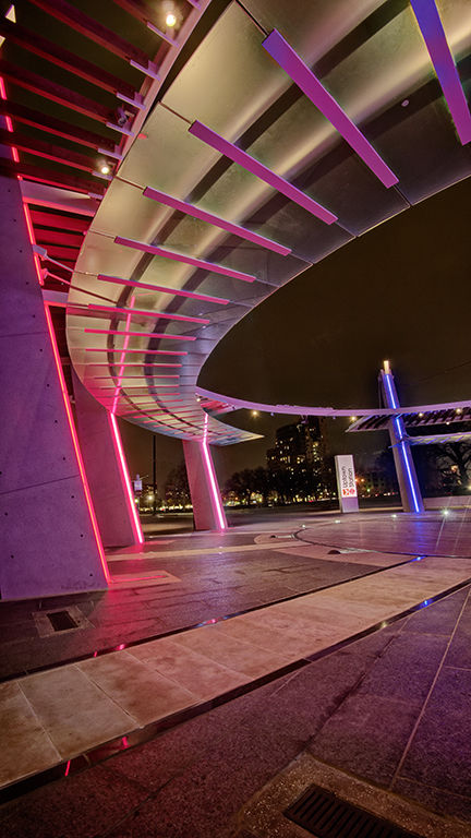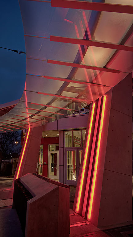 Vibrant color changing lighting reflects the lively energy this neighborhood is known for. The color changing lighting is integrated into the architecture of the trolley station, and the polished wire framework of the Garten sculpture creates a layered twisting canvas ideal for washing with light. To remain budget conscious, color changing lighting is reserved for these two main elements while white lighting is used throughout the plaza and park on trees, water feature and low level pathway lighting. Step lights integrated into landscape benches and stake mounted tree accents create a comfortable, safe and inviting outdoor environment around the park and plaza.