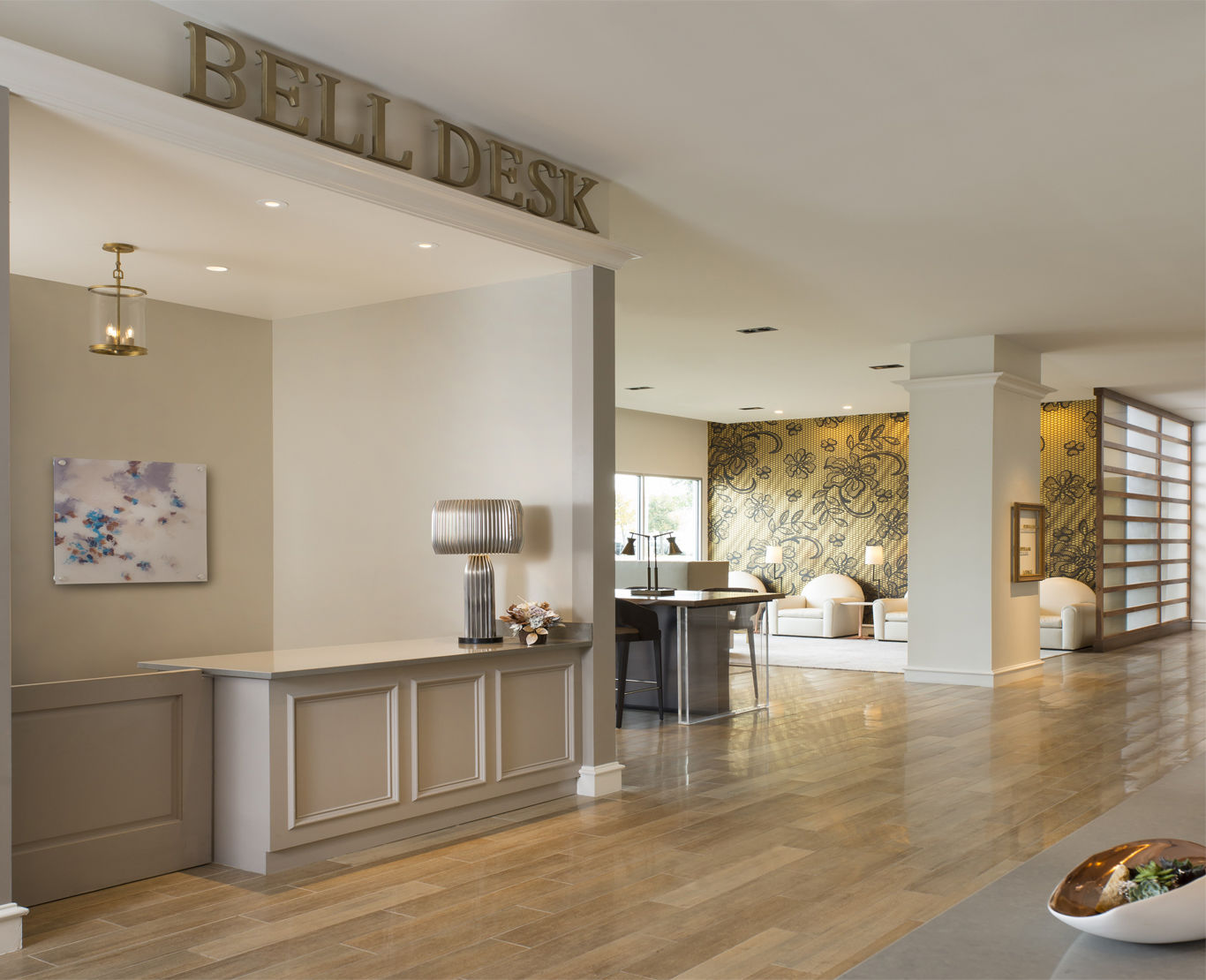 Modern interpretation of European markets with mid-century vibe through finishes and decorative fixtures. In the double height space the lights are located into recessed channels and all ceiling elements are arranged in lines to create an organized ceiling plan. Large sculptural decorative elements fill the lobby space with sparkles of light. The upper fixtures shine through the structural elements to create subtle shadows on the ground below.