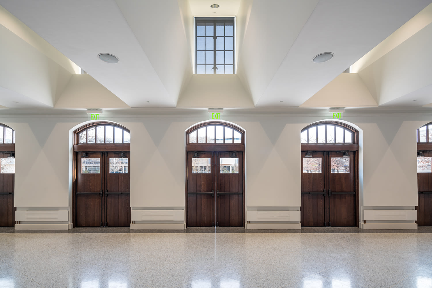 Formerly the campus Field House, the Faulkner Center restores the 1930’s exterior shell to its original appearance and adds emphasis to architectural details and materials. The east entry façade faces the campus thoroughfare. Here the wood doors, window casements, and lanterns were restored to their original design. Lighting was carefully integrated into the façade’s linear features, the plaza to emphasize the brick material flanking the entry doors, and hidden behind the roof parapet to light the restored triple flagpole and flags. Additionally, lighting is carefully placed at the interior of the main lobby, to create a glowing backdrop as seen through the windows. Historic lanterns at the plaza steps were restored and fitted with warm LED lighting. Small landscape lighting elements were added to highlight three sculptures.