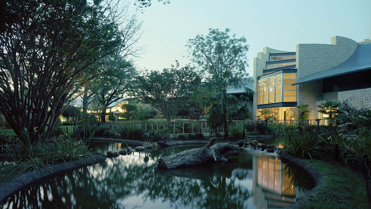 Guests entering from the sunny Texas sunshine are brought into a vestibule that is daylit and just below water level to observe the amphibians swimming in the adjacent lake. Then they progress into a darkening gallery where the guest area is quite low-level, while the exhibits appear to glow, each with their own quantity and color temp of light. The dappled-light gallery feels as if one is moving through a rain forest, with sunbeams created by spots shining through printed acrylic hexagonal panels to create shafts of sunlight.