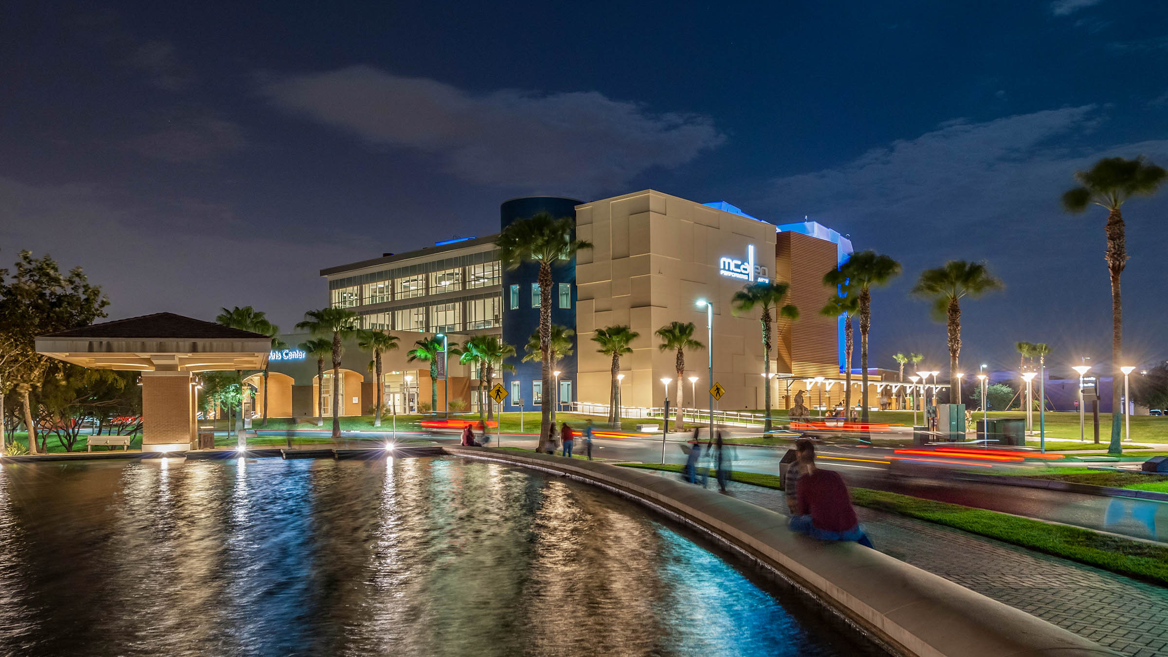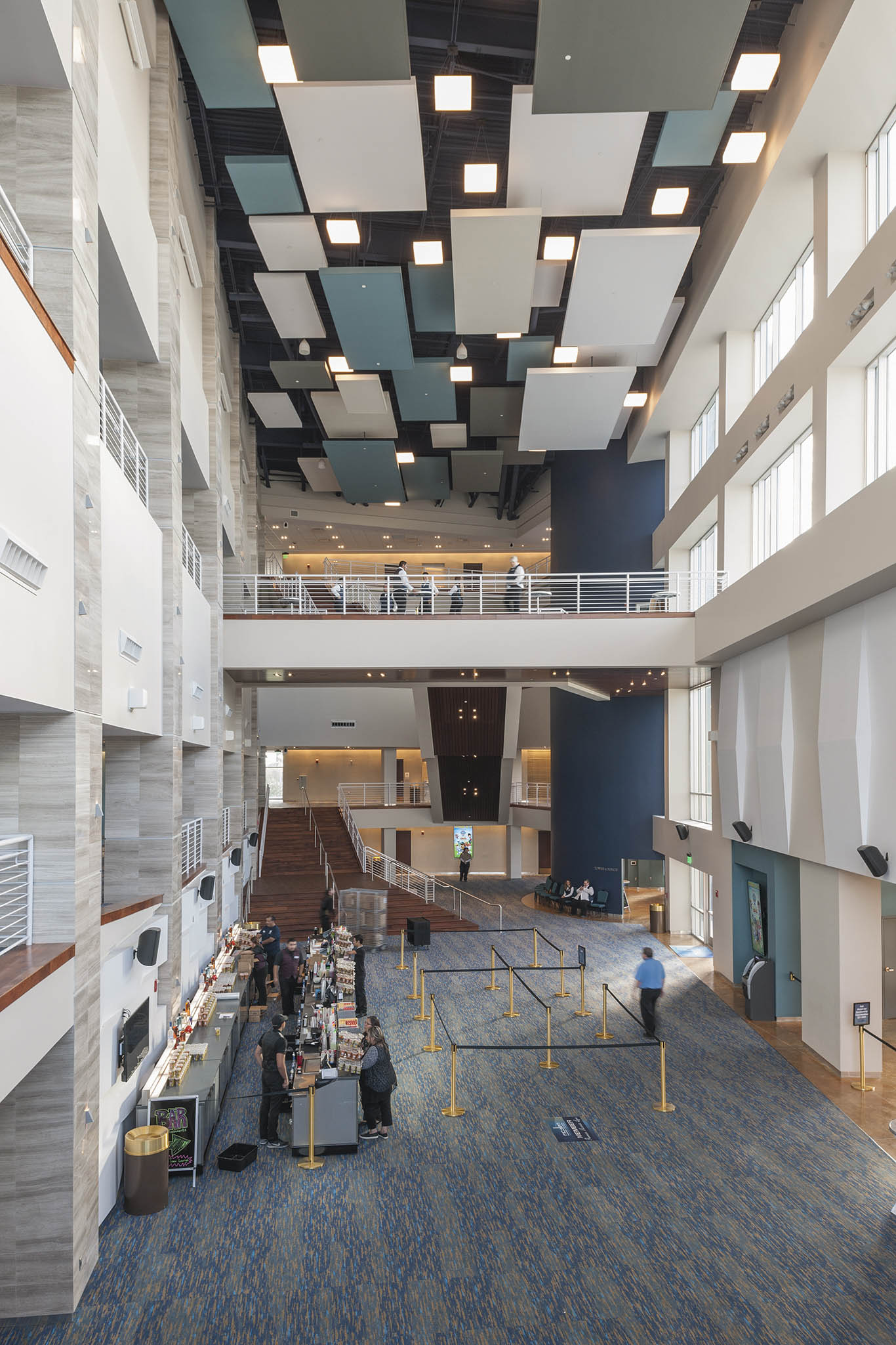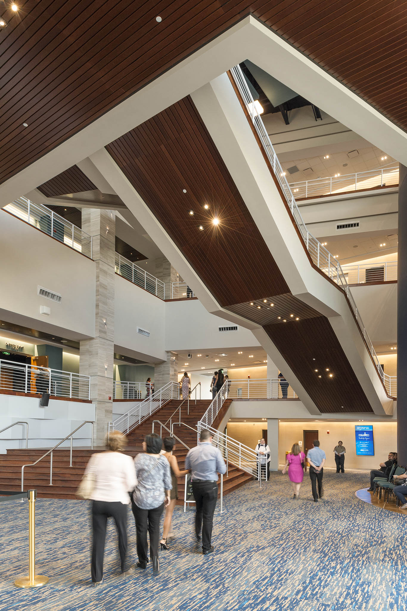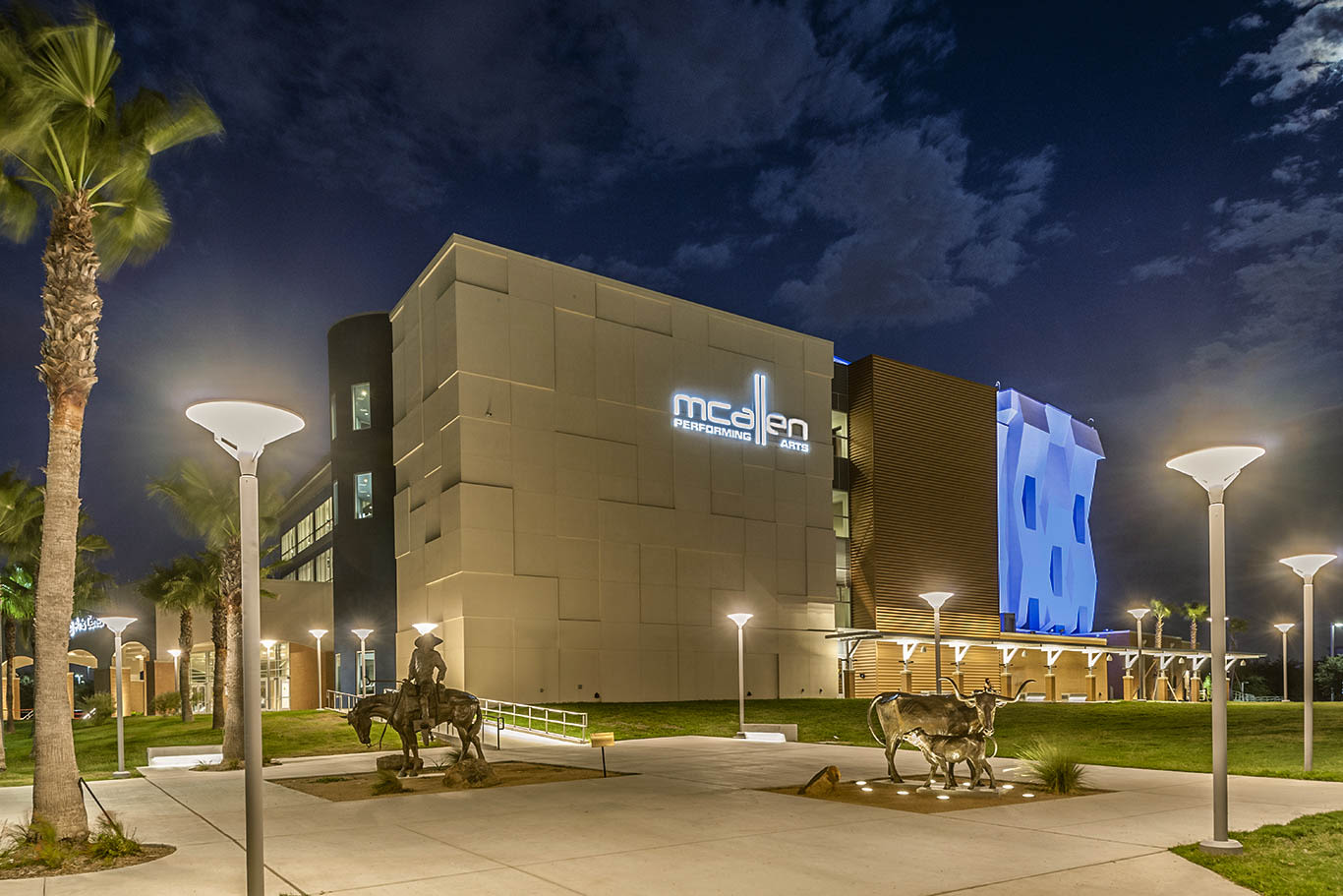 Built on the southeast corner of the lake-centered cultural center, the McAllen Performing Arts Center is situated to take advantage of the park and lake views from the grand, multi-tiered pre-function space. Making the building come alive at night as seen from other locations in this cultural center was paramount, while also preserving the exterior views as experienced from the interior. Careful placement of uplights to flood the ceiling, floating squares and a sparkle of sconces falling down each column assists to express the interior volume without over-lighting so as to maintain interior-exterior visual balance