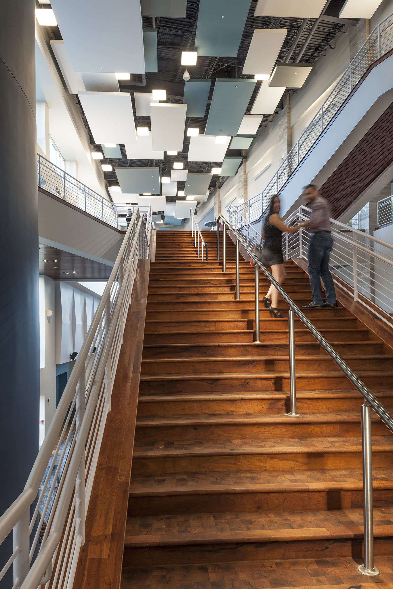 The exterior of the stage house is dynamically facetted and is lit with precisely placed color-changing flood lights to wash both angles of the facets and limit spill to the sky. The interior feature stair proved challenging to light. This ribbon can sometimes take advantage of lighting from a surface above, and other times is quite exposed in the volume. A lit handrail with varying beam-angles proved to be the most consistent approach.