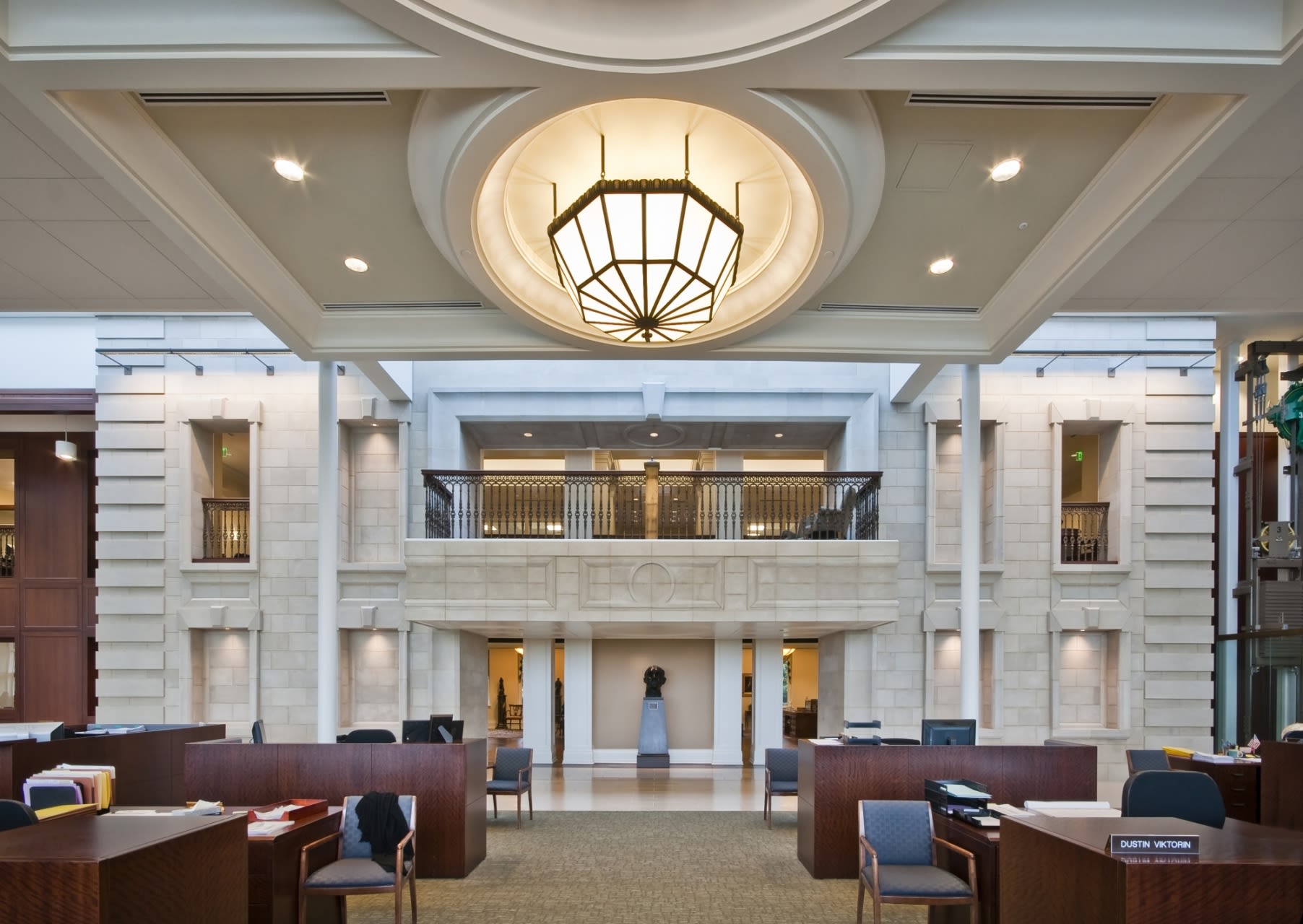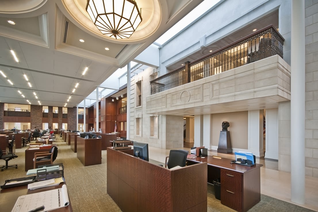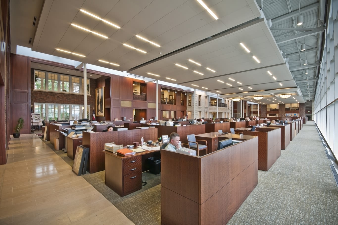 If walls could talk, the historic buildings at Old Parkland would tell stories. The original 1894 Parkland Hospital was a wooden structure that was replaced by a modern brick building in 1913, with two wings added in 1921. When Parkland Hospital moved to a new building a mile away in the mid-1950s, the older facility, with an adjacent Nurse’s Quarters, treated psychiatric and tuberculosis patients for another 20 years. It served as a low-security jail for a short while, and fell into disuse for almost 20 years. It was owned by Dallas County from 1996 to 2006, it was finally developed into the office complex it is now in 2008. As a historic landmark, the original Parkland Hospital and Nurse’s Quarters were to be preserved on the exterior and treated with a traditional hand on the interior. The new open office is a modern glass box purposefully floating between the arms of the 1921 wings. Lighting for the traditional spaces puts period decorative pendants, sconces and surface mounts at the forefront, with supplemental architectural lighting only as needed. This decorative component spills into the modern spaces, but architectural lighting becomes part of the architecture.