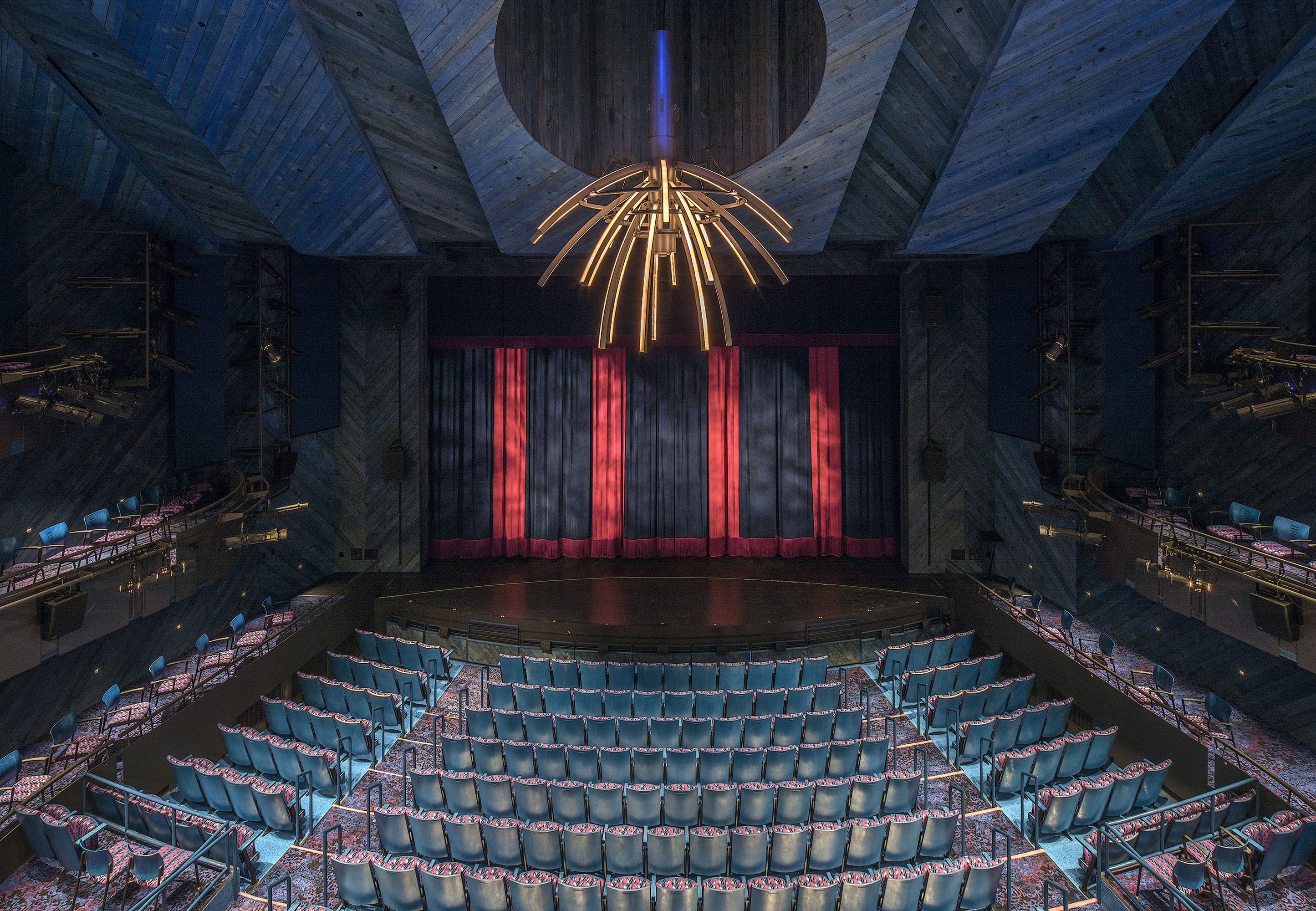 In the proscenium theater the spatial limitations spurred an innovative design that combines technical controls with mechanical movement. The custom designed RGBA programmable and movable chandelier tucks up into a ceiling dome to allow high-raking followspots to reach the stage. The chandelier is also a working tool for the students, allowing them to program the lighting effects to fit the storyline of their performances. Initial inspiration came from a firework raining down in the dark blue sky, but quickly developed into many more possibilities.