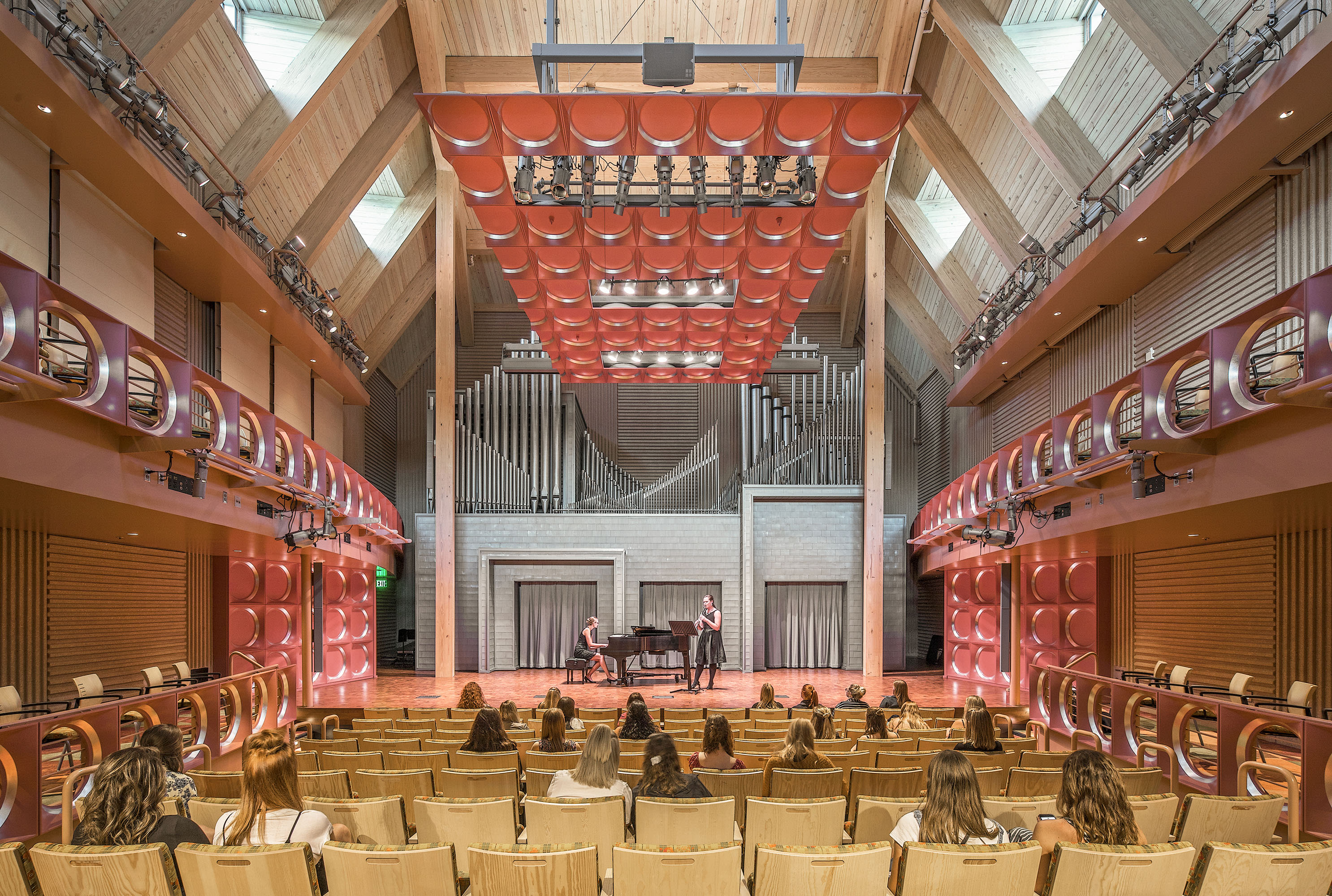 In the Recital Hall, mounting on the wood ceiling and concrete walls was prohibited, so houselights for the orchestra integrate into the acoustical reflector. Lighting pipes on balcony fronts tuck in mini-theatrical fixtures for circulation paths. Side galleries and textured walls are grazed with downlights from upper acoustical shelves.