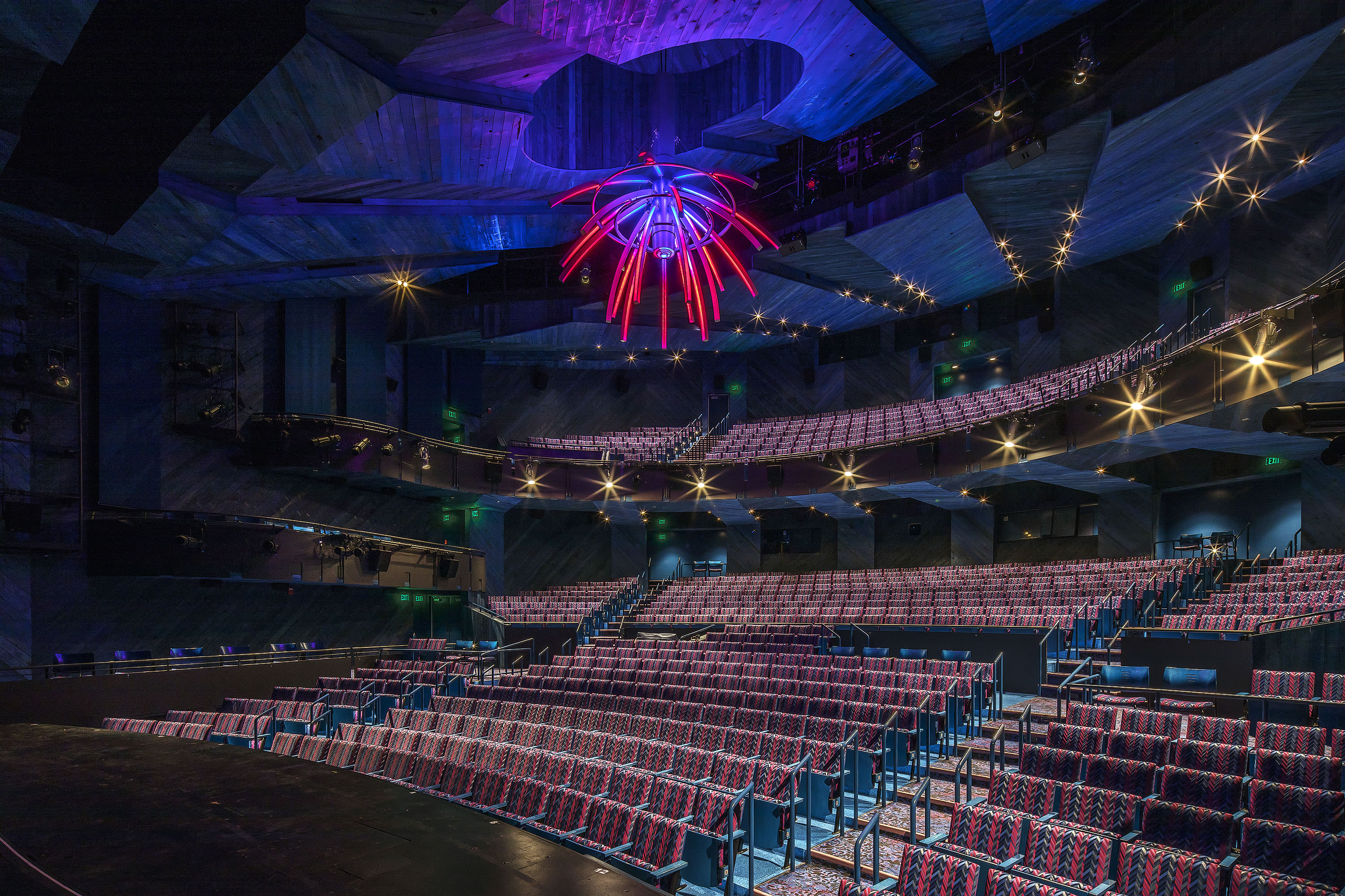 House lighting for orchestra seating is mounted to lighting pipes and catwalks for easy access. Houselights at rear are mounted to sides of coffers. Above the balcony discreet removable ceiling panels allow easy aiming and maintenance from above. Remote drivers at catwalks for ease of access. All lighting in the performance spaces is LED, controlled via DMX, and dims to dark. Extensive testing and mock-ups, using the specified luminaires on the specified control system allowed the lighting designer to select the best drivers, and to work with the controls manufacturer to set the best dimming curves for each driver type, well in advance of the ordering and installation process.