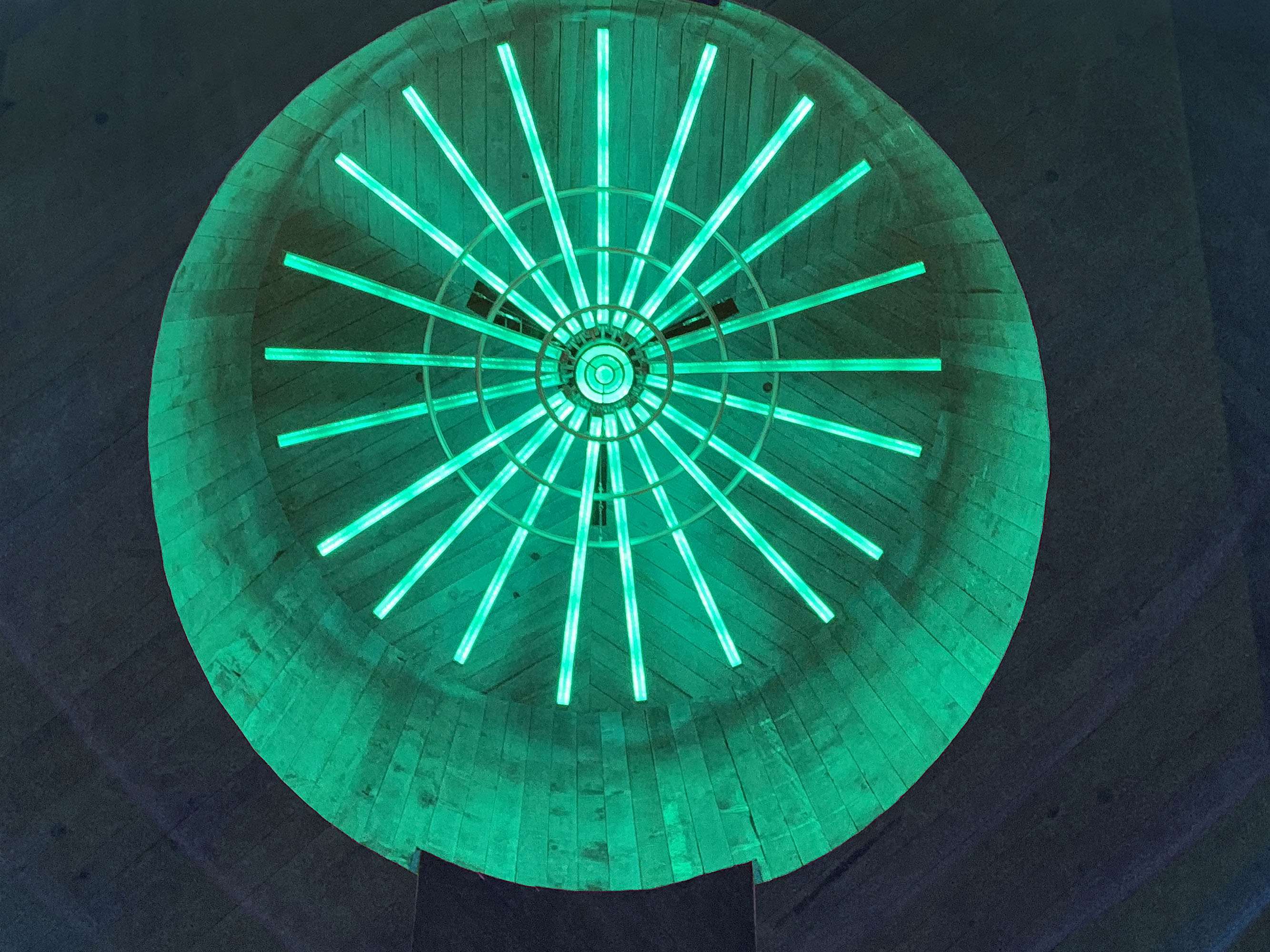 Typical theatrical DMX system would require 41 DMX universes and 41 cables feeding to the chandelier to control all the LED channels. This would be incredibly cumbersome and problematic for the rigging system. Using ArtNet to talk to LEDs, allowed control of ~21,000 individual diode addresses with one cat5 cable and one power drop. A video show controller, meant for live entertainment shows, was used to program and run the Artnet controls. To make this system work in an architectural environment, it was then connected to the main theatrical DMX system where a series of signals is sent to run the lighting shows. This allows shows to be saved and easily triggered via touchscreens. The video controller and DMX controller are permanently setup on servers in the electrical closet to allow system to run as needed in an architectural environment.