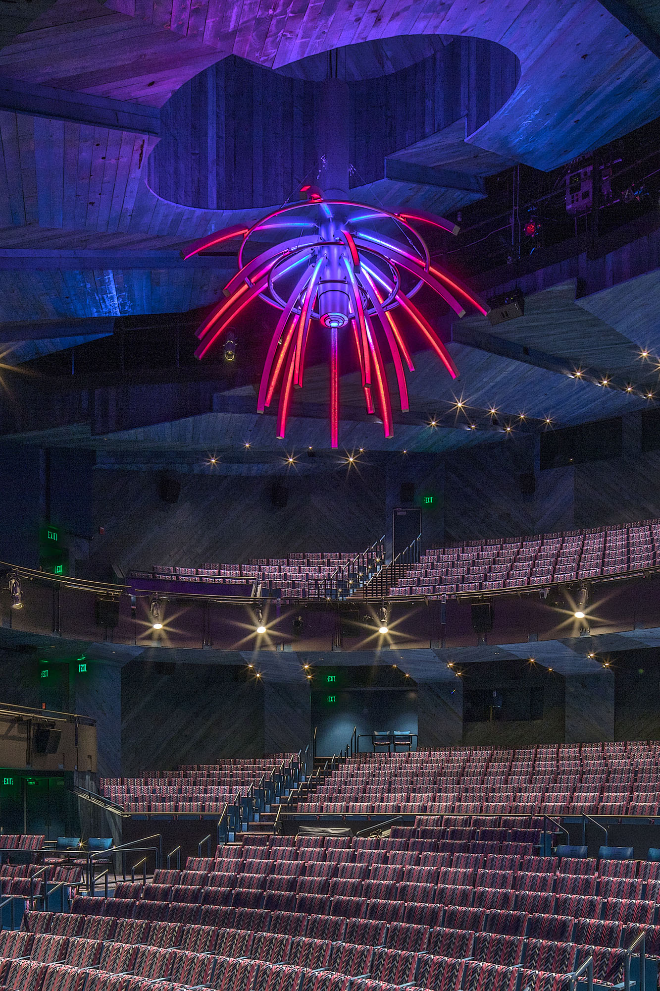 Two runs of RGBA chips every 0.75” line the sides of the chandelier arms to allow an immense possibility of colors and effects. Custom programming effects are compiled and arranged into themed shows that relate to the chandelier shape and position such as flowers blooming, swirling storm, and color explosion. These controls tie into the theatrical controls system and all lighting shows and house lighting scenes can be triggered via touchscreen lighting board. Located in the mid-west, this installation provides exposure and access to advanced design and controls for students in the region. Extensive coordination, foresight and communication with contractors, manufacturers, programmers and university personnel was required to pull off the precise installation schedule. Creating a comradery with the whole team was essential in ensuring the design met its full potential. A special lens was researched and selected to create sparkle yet obscure view and blend color of diodes. Multiple mockups of joints, lenses and wiring with the manufacturer ensured the robust mechanical elements remain elegant.
